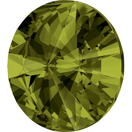 Round Rivoli-type stone in Olivine F color. It features a symmetrical shape and an intense green shade with a clear shine. Used in jewelry, decorative elements, and creative projects where a strong color and classic stone form are required.