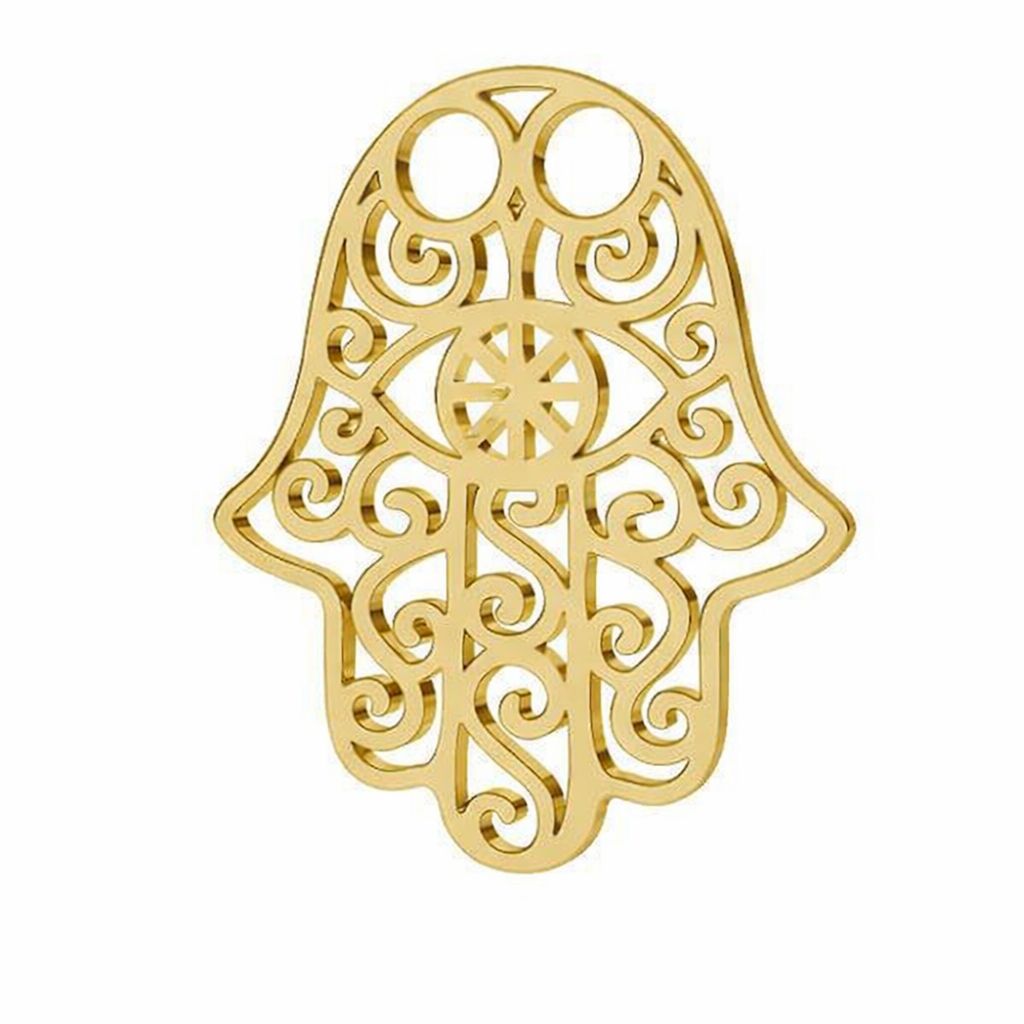 The openwork Fatima Hand (Hamsa) pendant made of AU 375 gold is a symbolic jewelry component with an amuletic character. Associated with protection, luck, and positive energy, it suits everyday and personalized jewelry designs.