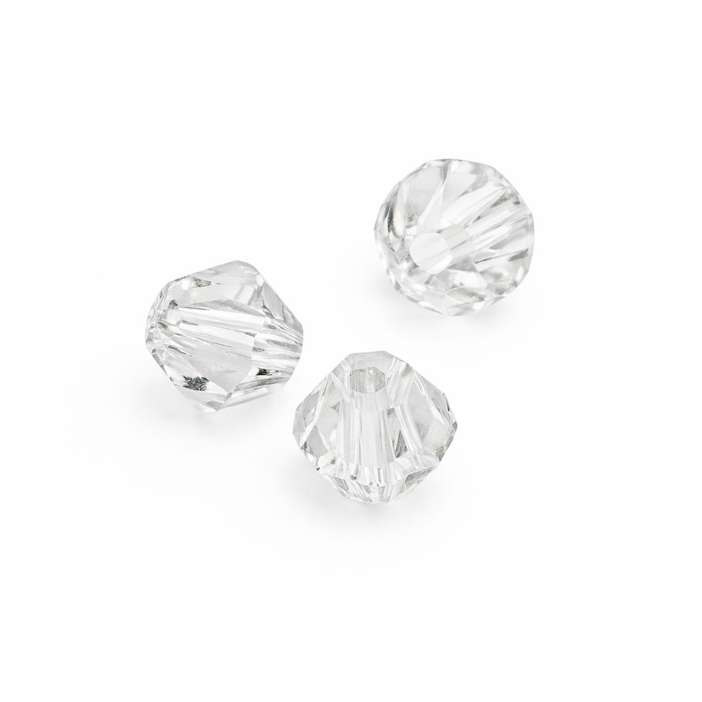 Faceted bicone bead in 4.0 mm size in Crystal color. Model 5328 features a central through hole for stringing onto thread, wire or cord. The double cone cut provides even light reflection. Crystal color is clear and transparent without AB coating. Suitable for bracelets, necklaces, earrings and decorative elements.